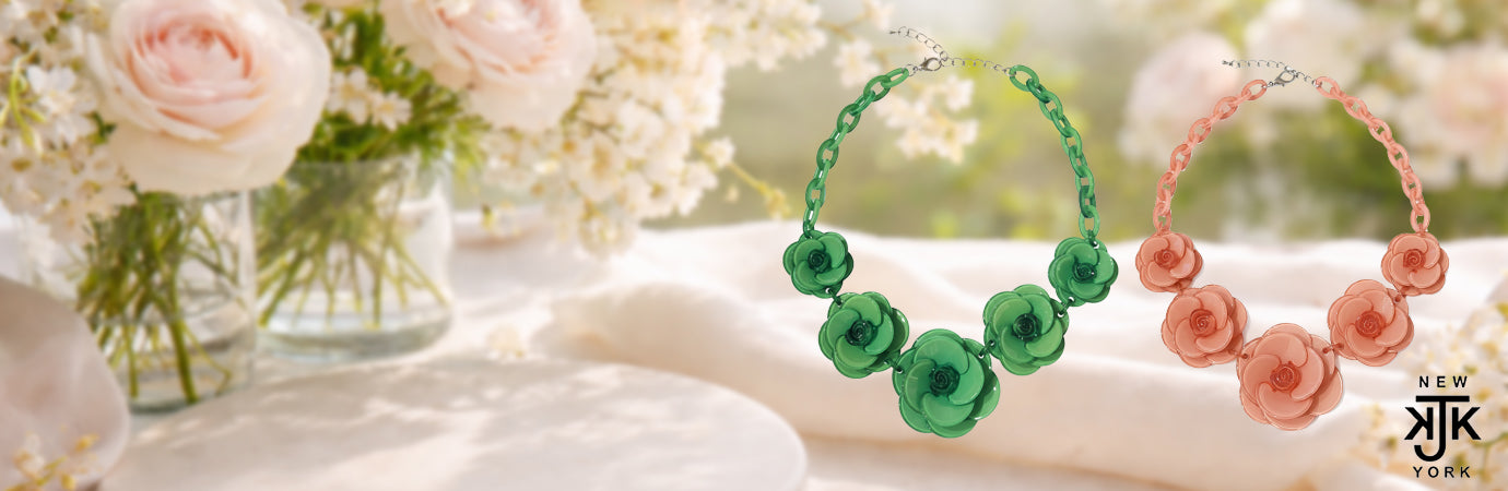 The collection features handcrafted Bohemian glass leaves, crystals, floral lampwork glass, and pearls, adding vibrant charm to countertops and jewelry displays.